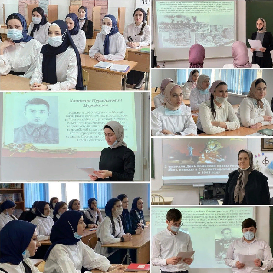 03.02.2022Сталинград-это героическая страница истории нашей страны. 1418 огненных дней Великой Отечественной войны складывались из таких вот отдельных побед. Победа советских войск в Сталинградской битве является крупнейшим военно-политическим событием в ходе Второй мировой войны. Великая битва, закончившаяся окружением, разгромом и пленением отборной вражеской группировки, внесла огромный вклад в достижение коренного перелома хода Великой Отечественной войны и оказала серьезное влияние на дальнейший исход Второй мировой войны. 21 октября 1942 года во фронтовой газете «Красная Армия» вышел материал, посвященный нашему соотечественнику, участнику Сталинградской битвы, Нурадилову Ханпаше Нурадиловичу. В газете говорилось: «Доблестный рыцарь нашей Отчизны. Бессмертный герой Кавказа, сын солнца, орел орлов, пулеметчик-комсомолец Ханпаша Нурадилов… Из своего пулемета Нурадилов уничтожил 920 немцев, захватил 7 вражеских пулеметов и 12 фашистов взял в плен». В ходе Сталинградской битвы в сентябре 1942 года Ханпаша Нурадилов командовал пулеметным взводом. Тяжело раненый, он не оставил поле боя, уничтожив 250 немцев и 2 пулемета. Погиб в этом бою 12 сентября 1942 года. В рамках реализации Единой Концепции духовно-нравственного воспитания и развития подрастающего поколения Чеченской Республики в ГБПОУ «ГПК имени С. С-А. Джунаидова» были проведены кураторские часы, посвященные 79 годовщине Сталинградской битвы. С целью показать обучающимся немеркнущий с годами героизм и патриотизм защитников Сталинграда, роль и значение Сталинградской битвы в ходе Второй мировой войны, обратить внимание обучающихся на то, что лучшие нравственные качества, проявленные нашими предками, и совершенный ими подвиг, не могут и не должны быть забыты со временем.