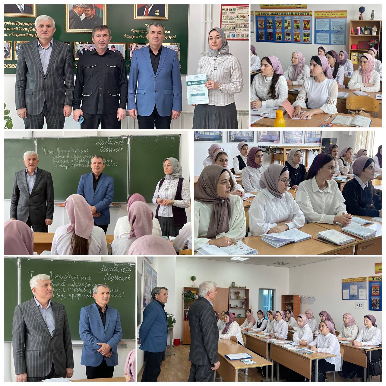 15.03.2022В рамках профориентационной работы на базе колледжа прошла встреча студентов выпускных групп с представителями ЧГПУ - кандидаты исторических наук, доценты - Гайрабеков Аюб Якубович и Халитов Валид Хамзатович. Они ознакомили студентов – будущих абитуриентов с направлениями, по которым ребятам будет интересно продолжить обучение, с возможностями и условиями поступления. Студенты активно участвовали в обсуждении, задавали вопросы, на которые получили компетентные ответы. У ребят ещё есть немного времени подумать и принять правильное решение. Ведь будущее образование в ВУЗе является преимуществом в последующем трудоустройстве. А выбор учебного заведения – первый шаг к построению собственной карьеры. Аюб Якубович подарил библиотеке колледжа журнал «Известия» со статьей, посвященной первому директору Гудермесского педагогического училища - Дадагову Бадруддину Дадаговичу. (Дала гечдойла цунна!)