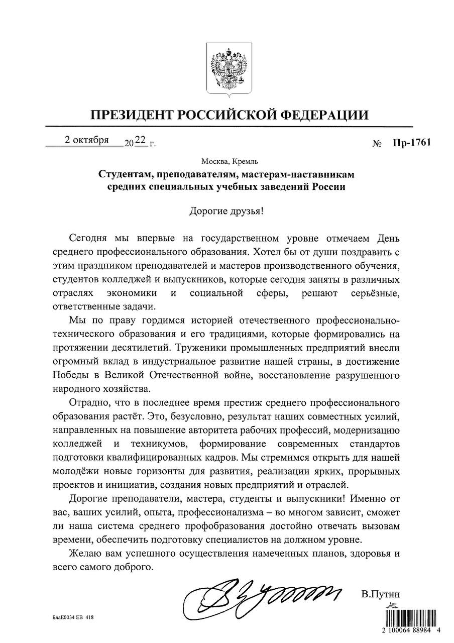 Президент Российской Федерации Владимир Путин поздравил студентов, преподавателей и мастеров-наставников с Днём среднего профессионального образования.