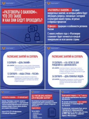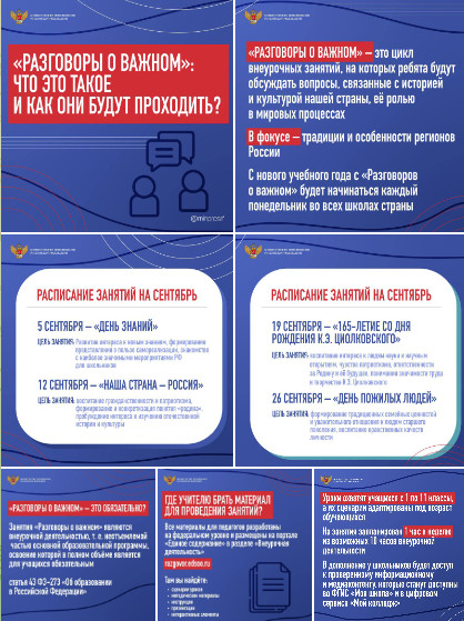 31.08.2022«События, люди, их деяния и идеи – всё это может стать предметом бесед. Наверное, найдутся скептики, которые скажут, что нельзя интересно рассказать про государственные праздники или про семейные ценности. Но мы делаем всё, чтобы доказать обратное: про историю, традиции и культурное наследие нашей страны можно и нужно рассказывать увлекательно, побуждать детей самостоятельно искать исторические факты, больше читать, узнавать новое», – рассказал министр просвещения Сергей Кравцов в интервью для ТАСС. Глава ведомства отметил, что: темами разговоров станут и простые человеческие ценности, например, дружба, уважение к труду, сохранение исторической памяти, милосердие и справедливость. Ученики будут вовлечены в обсуждение – педагогу особенно важно помнить о том, что они не должны повторять традиционные для урока формы. Подробности – в нашей инфографике и материале ТАСС