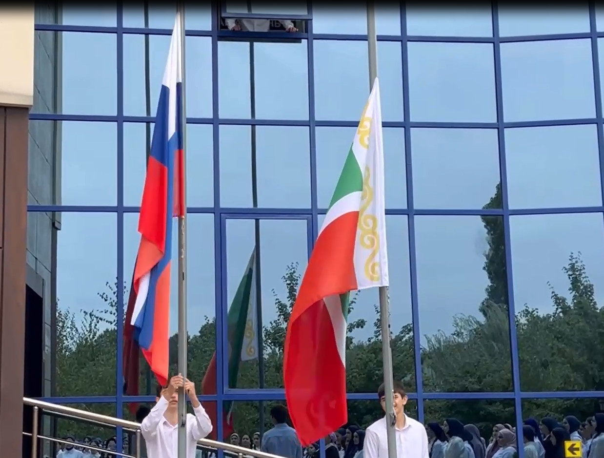 Учебная неделя в ГБПОУ «ГПК имени С. С-А. Джунаидова» началась с торжественного поднятия флага Российской Федерации и Чеченской Республики под исполнение гимнов.