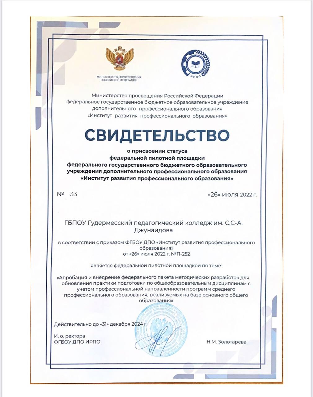 ГБПОУ «Гудермесский педагогический колледж имени С. С-А. Джунаидова» присвоен статус федеральной пилотной площадки.