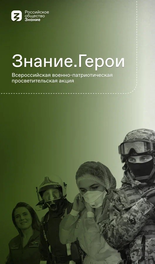 Общероссийская общественно-государственная просветительская организация «Российское общество «Знание» (далее – Российское общество «Знание») запускает Всероссийскую военно-патриотическую акцию Знание.Герои (далее – Акция), которая пройдет в период с 18 апреля по 31 мая 2023 года.
