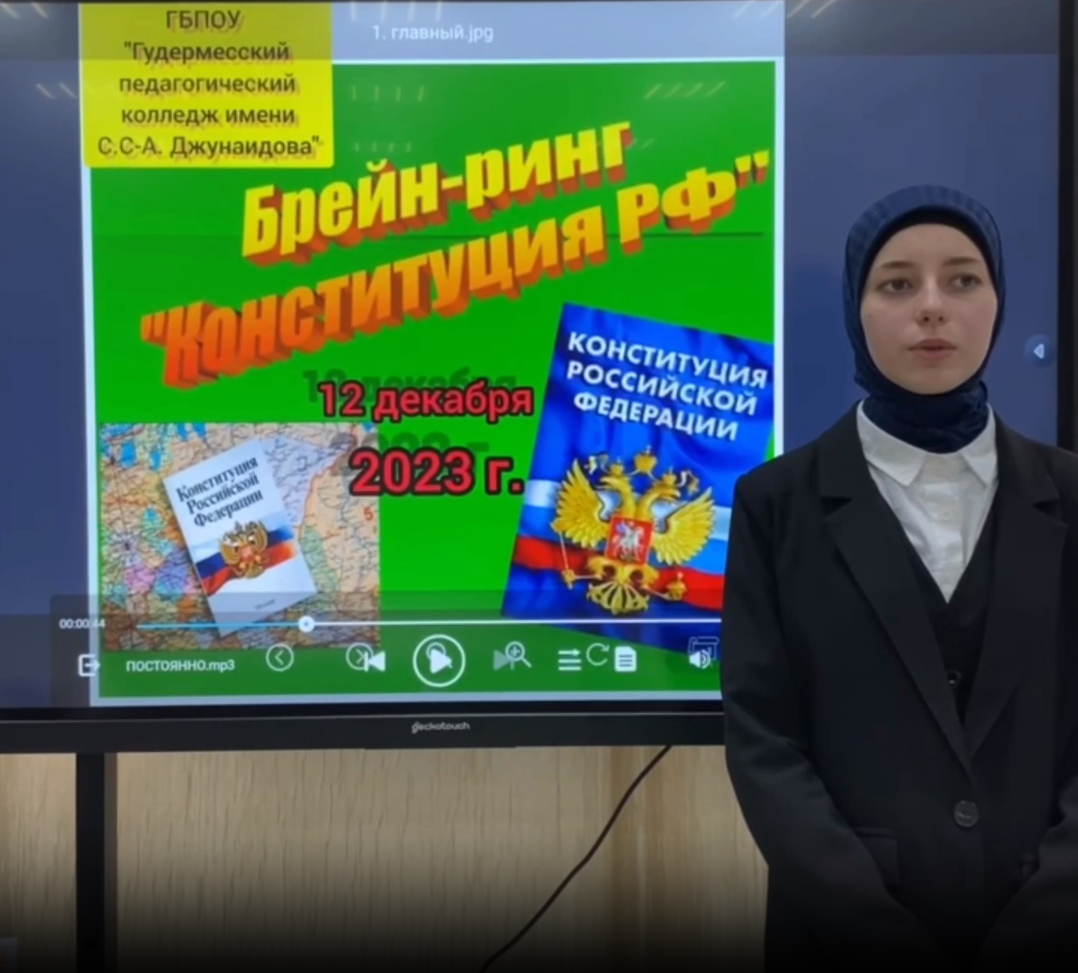 12.12.2023В рамках реализации Единой Концепции духовно-нравственного воспитания и развития подрастающего поколения Чеченской Республики, музыкальный руководитель Асхабова З.Б. , педагог-организатор Махаева Ф.С., и советник директора по воспитанию и взаимодействию с ДОО Яшадова Т.А провели викторину ко Дню Конституции РФ: «Закон, по которому мы живем». День Конституции в России отмечается 12 декабря. В этот день 1993 года всенародным голосованием была принята Конституция Российской Федерации, а с 1994 года указом президента России - 12 декабря был объявлен государственным праздником. Мероприятие способствовало расширению знаний о конституционных основах нашего государства, формированию уважительного отношения к Конституции, следованию заложенным в ней нормам и общечеловеческим ценностям. Празднование Дня Конституции РФ – это замечательный повод задуматься о себе, о нас, о нашей жизни в замечательной стране – России, ведь знать Конституцию должны все люди. Мероприятие прошло продуктивно и познавательно.