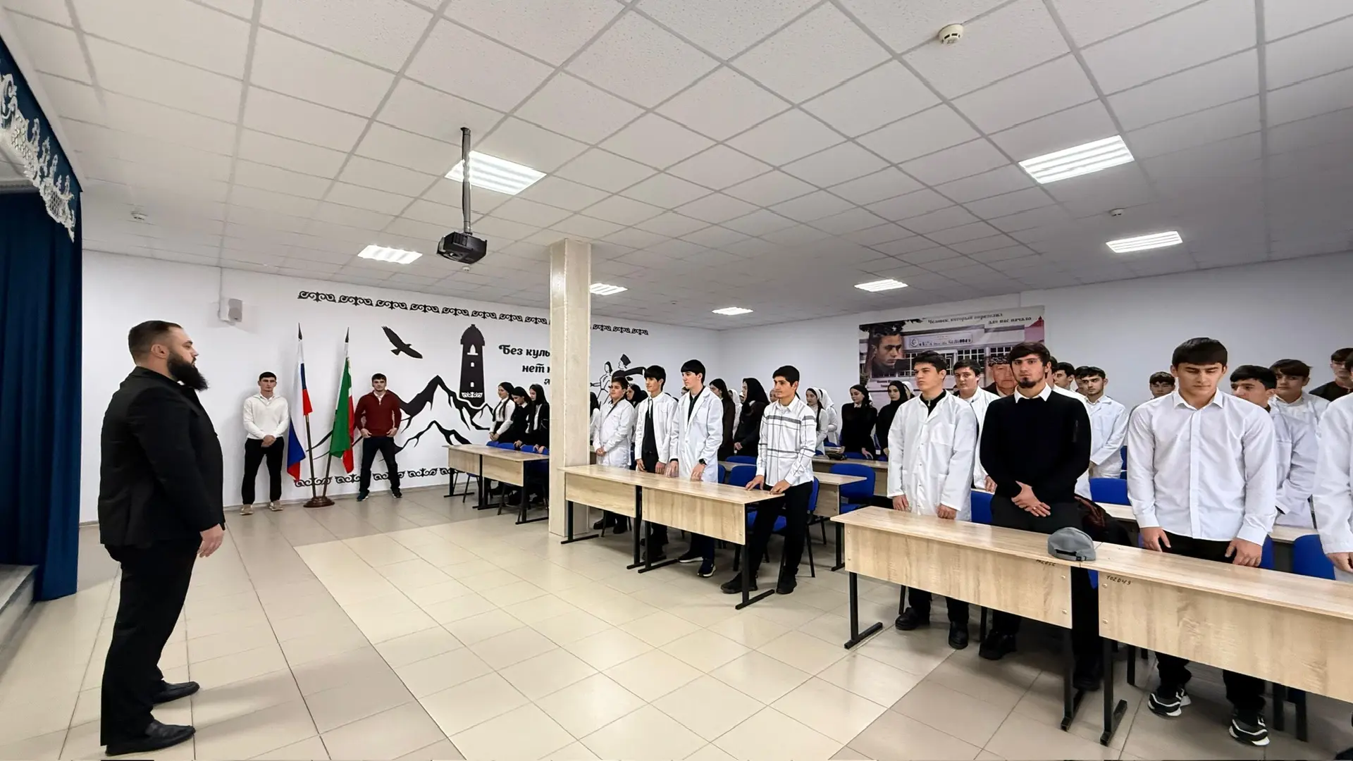 15.12.2025Сегодня в ГБПОУ «КГК им. Ш. Калиева» прошла еженедельная линейка, которая началась с выноса государственного флага Российской Федерации и Чеченской Республики под исполнения Гимнов РФ и ЧР.